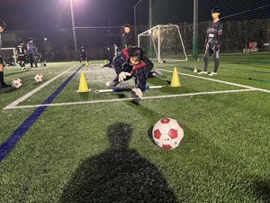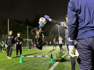 グラウンダーのシュートに対しては胸と太ももを近づけ、低い姿勢を取り、上に飛ばずにボールに最短で向かうことができるようにしましょう!